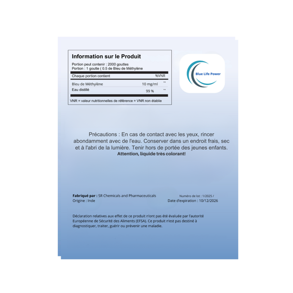 Compostion du produit : 1% de bleu de méthylène en poudre pharmaceutique pur à 99.6%, 100 ml eau distillé.