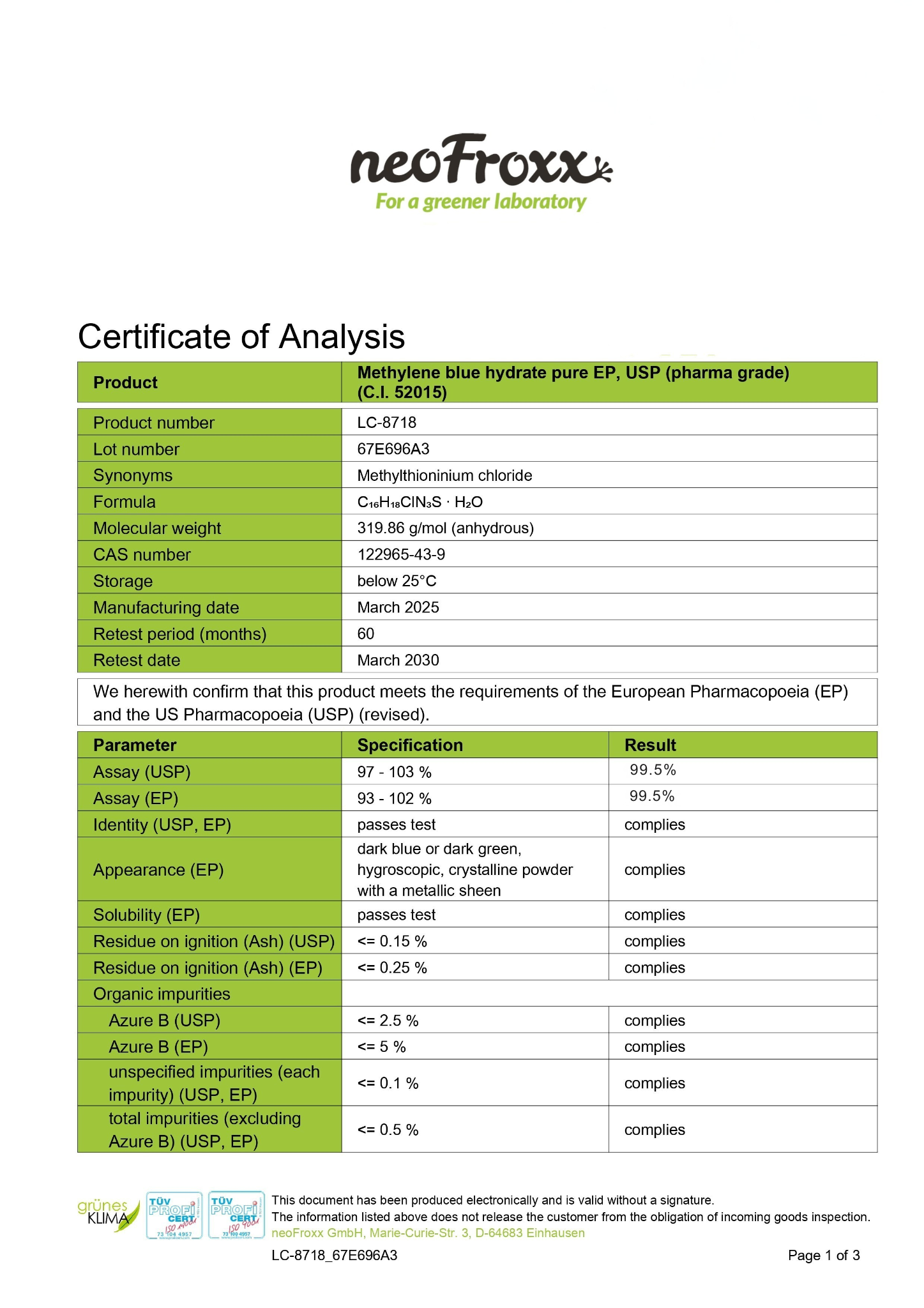 Solution de bleu de Méthylène à 1% pharmaceutique pur à 400 ml | Ultra Haute Pureté USP - Testé | Sans métaux lourds | Bleu de Méthylène | Bouteille en verre | Blue Life Power®