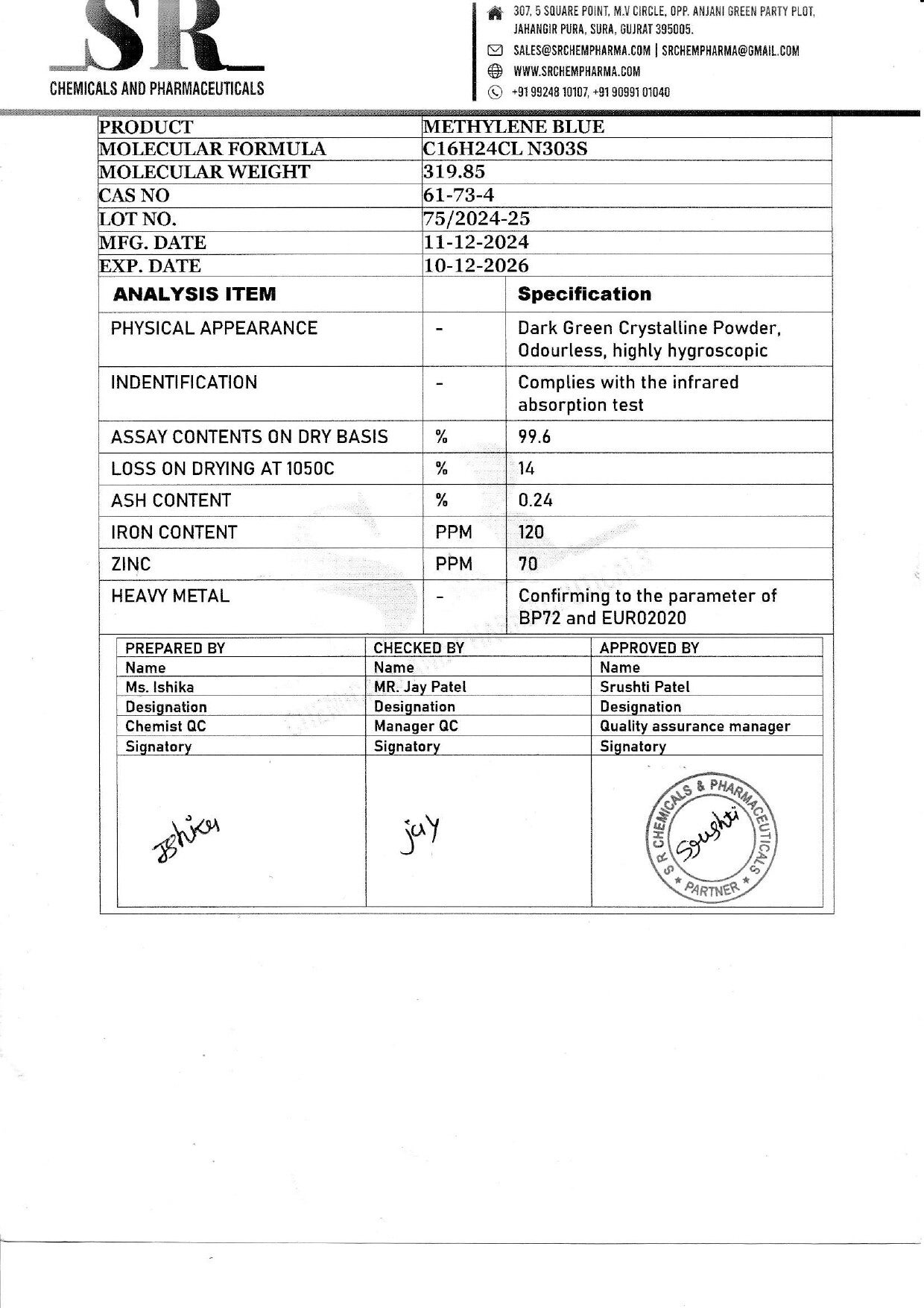 Compostion du produit : 1% de bleu de méthylène en poudre pharmaceutique pur à 99.6%, 100 ml eau distillé.